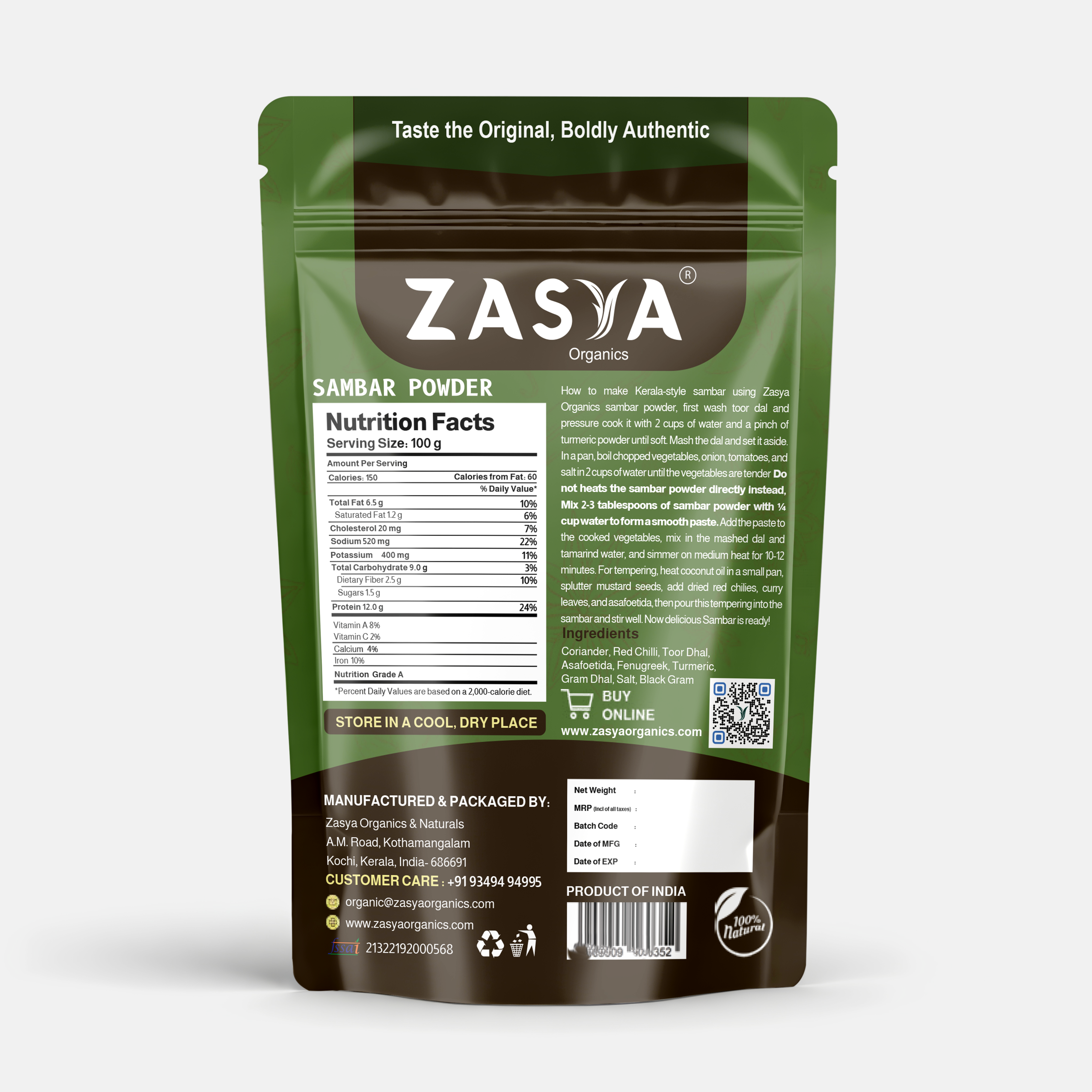 We source only the finest ingredients to ensure that our Sambar Powder delivers the best possible flavour and quality. Each spice and herb is carefully selected for its freshness and potency, guaranteeing that your sambar will have a rich, robust taste. From coriander seeds and cumin to fenugreek and red chilies, every ingredient is chosen for its ability to enhance the overall flavor profile.