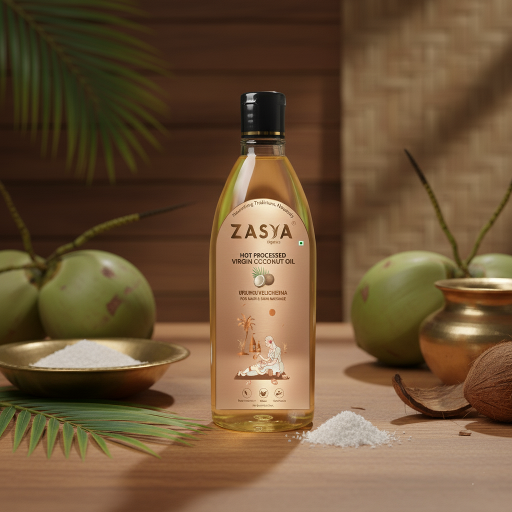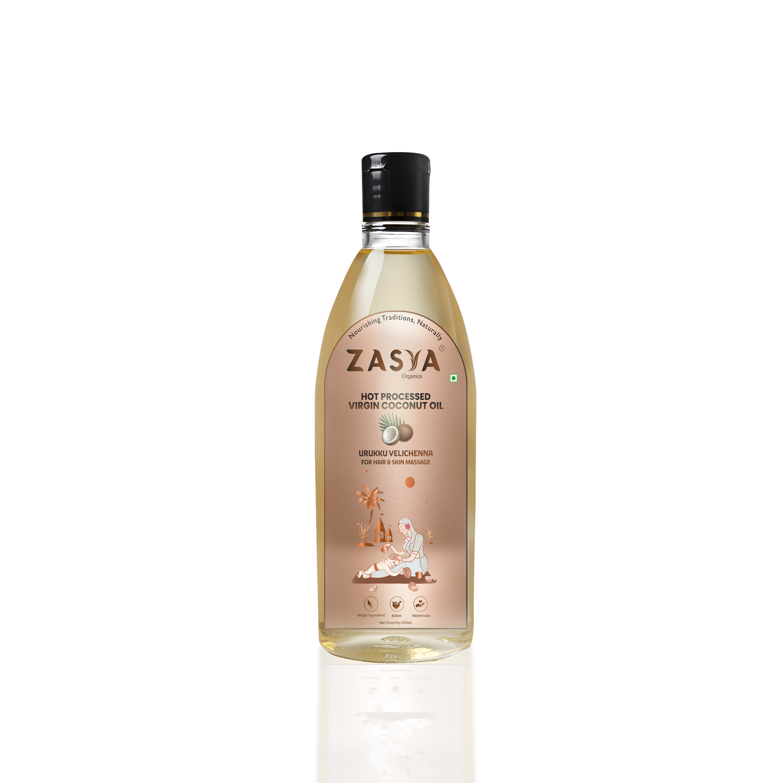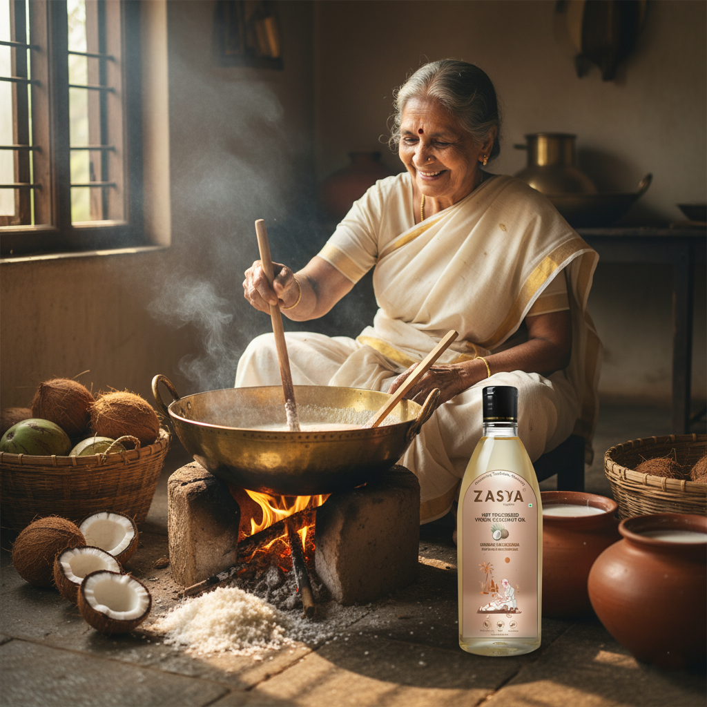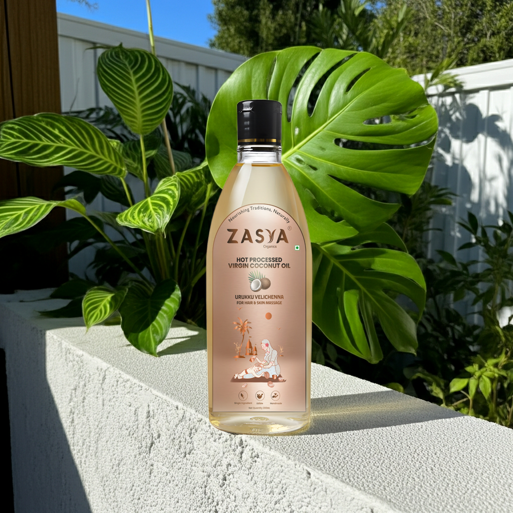 In every family, there’s a timeless recipe passed down by grandmothers — a recipe that carries wisdom, care, and love. Zasya Organics Hot-Processed Virgin Coconut Oil (Urukku Velichenna) is one such treasure, made the way our grandmothers did in Kerala kitchens for generations. Using only fresh coconut milk (not dried copra), this oil is gently heated in a traditional bronze vessel (uruli) until its natural goodness is released. The result is a pure, nutrient-rich, golden oil that embodies heritage, wellness, and the comfort of home.